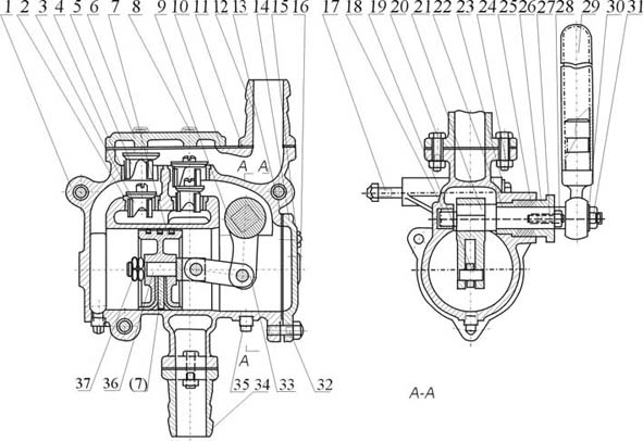 S、SH-25、38型手搖泵的結(jié)構(gòu)原理是,當(dāng)用手往復(fù)搖動(dòng)搖手柄(29)時(shí),通過軸(21)、搖臂(9)、連桿(36)等傳動(dòng)機(jī)構(gòu),使活塞(7)作往復(fù)運(yùn)動(dòng)。如圖所示,當(dāng)活塞向左移動(dòng)時(shí),右端的泵缸體積逐漸擴(kuò)大,形成真空,液體從吸水管(34)經(jīng)過鑄在泵體旁邊的吸入流道頂開吸水閥進(jìn)入缸體右端。在同一時(shí)間里,缸體左側(cè)由于活塞的壓縮,使壓水閥(5)頂開,液體經(jīng)吐出管(11)排出。若活塞的運(yùn)動(dòng)方向返回向右時(shí),則泵缸左側(cè)吸入液體,泵缸右側(cè)排出液體,這樣往復(fù)不歇地把液體吸入排出。形成泵的工作。泵的壓水閥向上行程由蓋板(6)限止,吸水閥向上行程由壓水閥限止。蓋板與泵體用螺栓(8)緊固,活塞行程由泵蓋(14)和泵體限止。為了安裝在墻上或其它基礎(chǔ)上,泵體有三個(gè)螺栓孔。