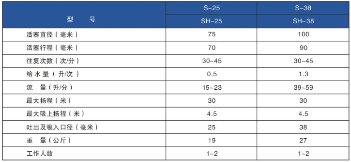 S、SH-25、38型手搖泵性能參數(shù)表: