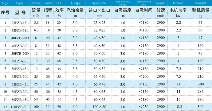 FZB型氟塑料離心自吸泵性能參數表: