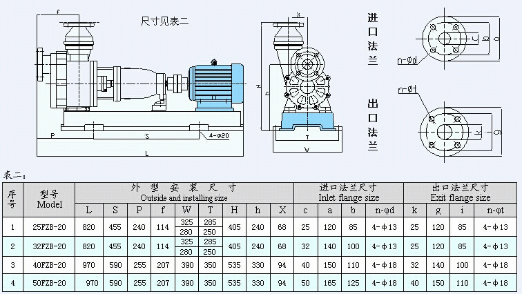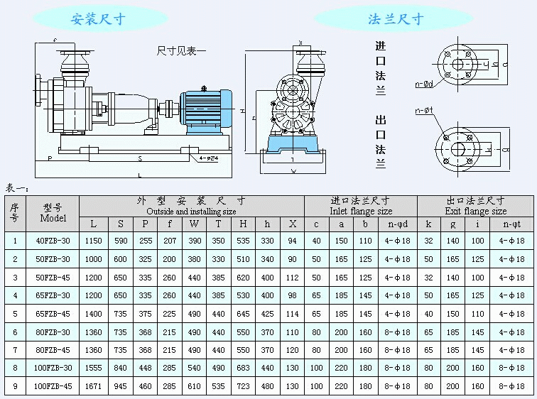 FZB型氟塑料離心自吸泵安裝尺寸表: