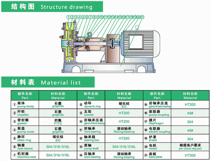 HJS石墨化工流程離心泵結(jié)構(gòu)圖與材料表: