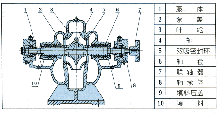 4、泵軸由兩個單列向心球軸承支承,軸承裝在泵體兩端的軸承體內(nèi),用黃油潤滑,雙吸密封環(huán)用以減少水泵葉輪處漏水。