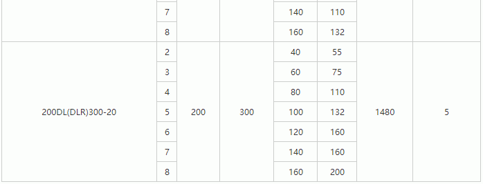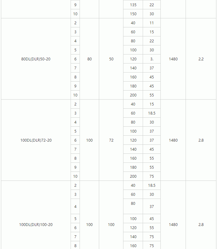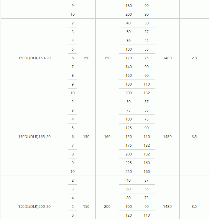 DL、DLR型立式多級(jí)泵性能參數(shù)表: