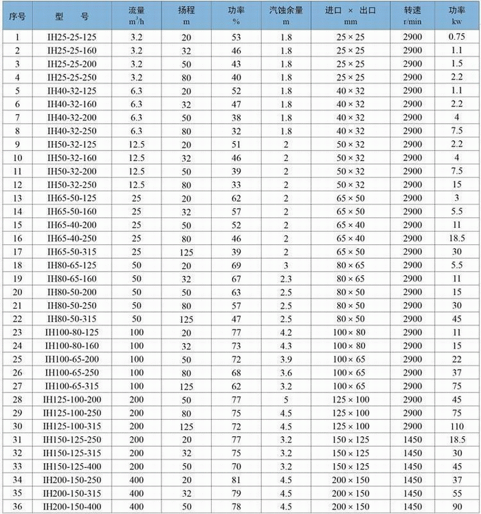 IH型不銹鋼化工離心泵性能參數(shù)表: