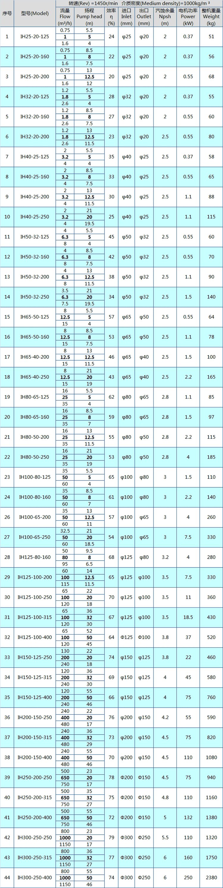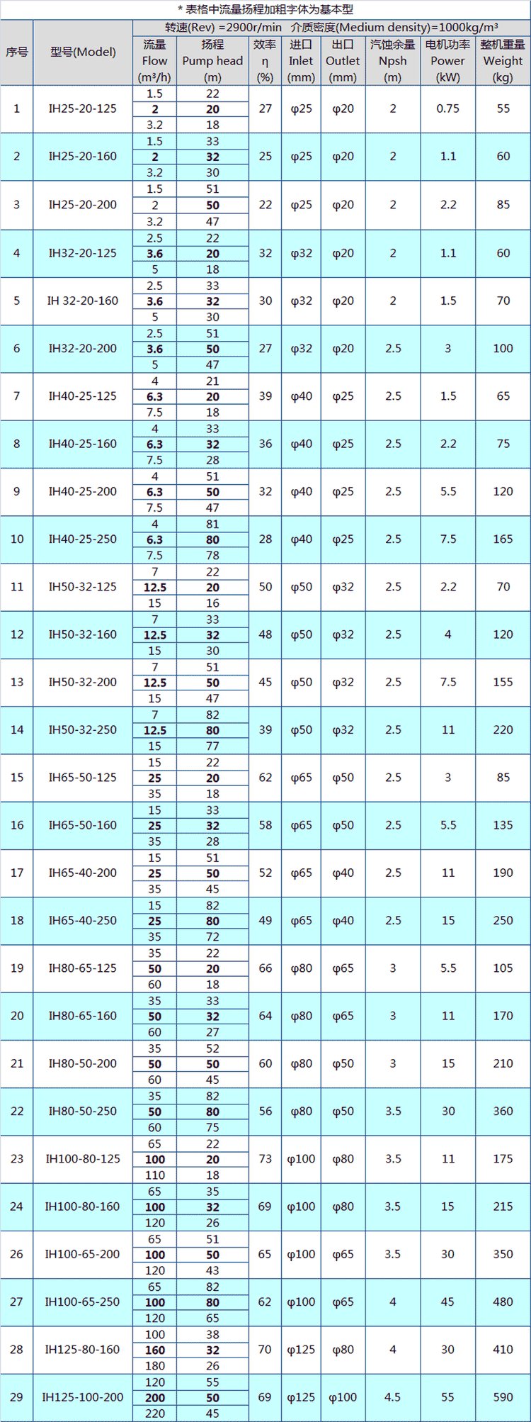 IH型不銹鋼化工泵性能參數(shù)表: