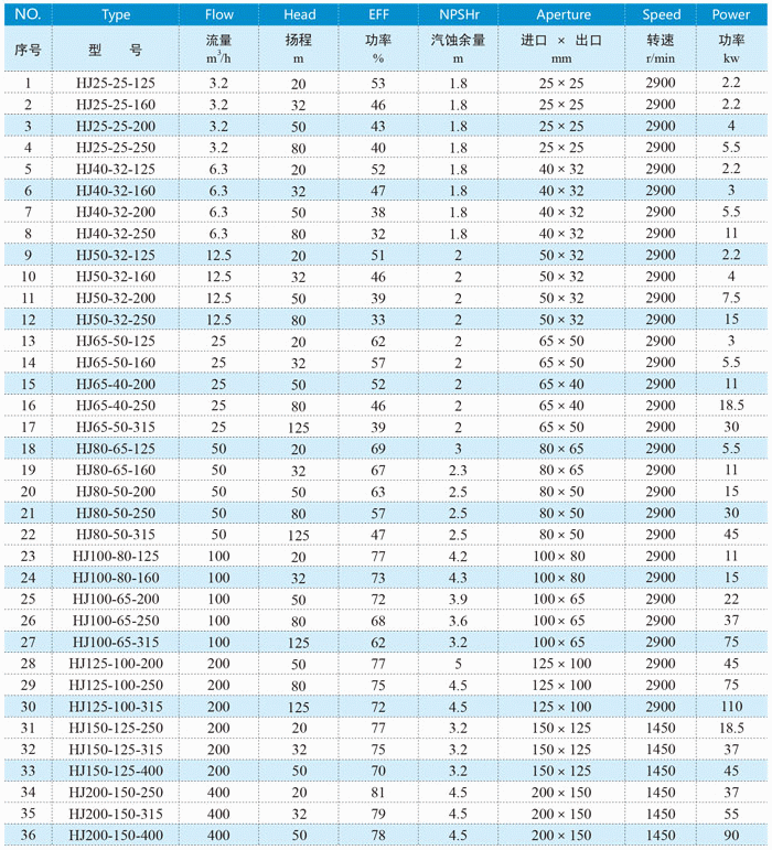 HJ型不銹鋼化工堿泵性能參數(shù)表: