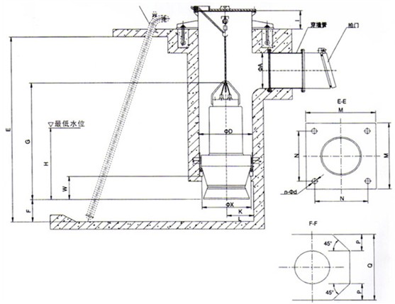 較小的QZ潛水軸流泵、QH潛水混流泵用開(kāi)關(guān)敞式進(jìn)水,安裝形式為井筒彎管式安裝、鋼制井筒式安裝、混凝土預(yù)制井筒式安裝。井筒彎管式安裝、鋼制井筒式安裝由本公司提供整套井筒,混凝土預(yù)制井筒式安裝由本公司提供安裝底座(含防轉(zhuǎn)裝置)、井蓋。
