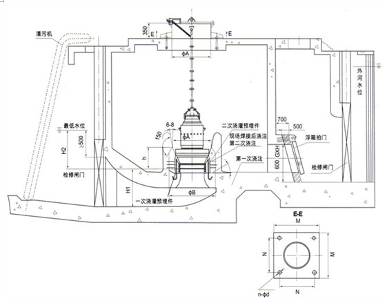 較大的潛水泵(葉輪直徑一般在1米以上),采用帶封閉進(jìn)水流道的安裝形式
