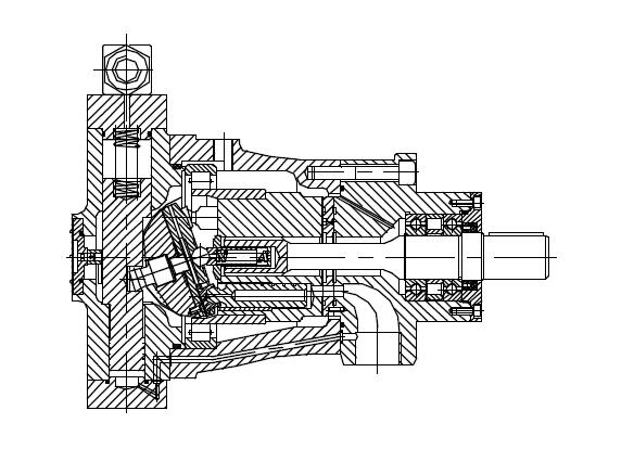 PCY14-1B恒壓變量軸向柱塞泵這種變量型式的泵,輸出壓力小于調(diào)定恒壓力時(shí),全排量輸出壓力油,即定量輸出,在輸出油液的壓力達(dá)到調(diào)定壓力時(shí),就自動(dòng)地調(diào)節(jié)泵流量,以保證恒壓力,滿足系統(tǒng)的要求。泵的輸出恒壓值,根據(jù)需要,在調(diào)壓范圍內(nèi)可以無(wú)級(jí)調(diào)定,泵的結(jié)構(gòu)見(jiàn)圖6,該結(jié)構(gòu)將輸出的壓力油同時(shí)通至變量活塞下腔和和恒壓閥的控制油入口,當(dāng)輸出壓力小于調(diào)定恒壓力時(shí),作用在恒壓閥芯上的油壓推力小于調(diào)定彈簧力,恒壓閥處于開(kāi)啟狀態(tài),壓力油進(jìn)入變量活塞上腔,變量活塞壓在最低位置,泵全排量輸出壓力油;當(dāng)泵在調(diào)定恒壓力工作時(shí),作用在恒壓閥芯上的油壓推力等于調(diào)定彈簧力,恒壓閥的進(jìn)排油口同時(shí)處于開(kāi)啟狀態(tài),使變量活塞上下腔的油壓推力相等,變量活塞平衡在某一位置工作,若液壓阻尼(負(fù)載)加大,油壓瞬時(shí)升高,恒壓閥排油口開(kāi)大、進(jìn)油口關(guān)小,變量活塞上腔比下腔壓力降低、變量活塞向上移動(dòng),泵的流量減小,直至壓力下降到調(diào)定恒壓力,這時(shí)變量活塞在新的平衡位置工作。反之,若液壓阻尼(負(fù)載)減小,油壓瞬時(shí)下降,恒壓閥進(jìn)油口開(kāi)大,排油口關(guān)小,變量活塞上腔比下腔油壓升高,變量活塞向下移動(dòng),泵的流量增大,直至壓力上升至調(diào)定恒壓力。