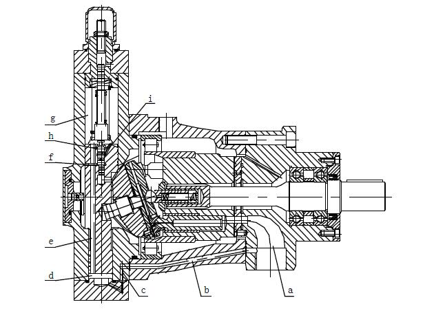 主體部分(參見結(jié)構(gòu)剖)由傳動軸帶動缸體旋轉(zhuǎn),使均勻分布在缸體上的七個柱塞繞傳動軸中心線轉(zhuǎn)動,通過中心彈簧將柱滑組件中的滑靴壓在變量頭(或斜盤)上。這樣,柱塞隨著缸體的旋轉(zhuǎn)而作往復(fù)運(yùn)動,完成吸油和壓油動作。 壓力補(bǔ)償變量泵的出口流量隨出口壓力的大小近似地在一定范圍內(nèi)按恒功率曲線變化。當(dāng)來自主體部分的高壓油通過通道(a)、(b)、(c)進(jìn)入變量殼體下腔(d)后,油液經(jīng)通道(e)分別進(jìn)入通道(f)和(h),當(dāng)彈簧的作用力大于由油道(f)進(jìn)入伺服活塞下端環(huán)形面積上的液壓推力時,則油液經(jīng)(h)到上腔(g),推動變量活塞向下運(yùn)動,使泵的流量增加。當(dāng)作用于伺服活塞下端環(huán)形面積上的液壓推力大于彈簧的作用力時,則伺服活塞向上運(yùn)動,堵塞通道(h),使(g)腔的油通過(i)腔而卸壓,此時,變量活塞上移,變量頭偏角減小,使泵的流量減小。 調(diào)節(jié)流量特性時,可先將限位螺釘擰至上端,根據(jù)所需的流量和壓力變化范圍,調(diào)節(jié)彈簧套,使其流量開始發(fā)生變化時的初始壓力符合要求,然后將限位螺釘擰至終級壓力時的流量不再發(fā)生變化,其中間的流量與壓力變化關(guān)系由泵的本身設(shè)計(jì)所決定。