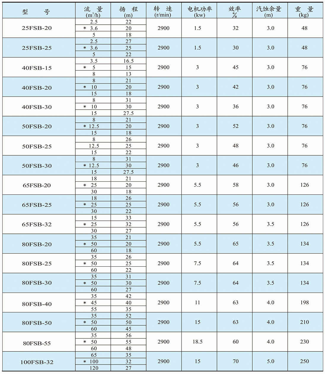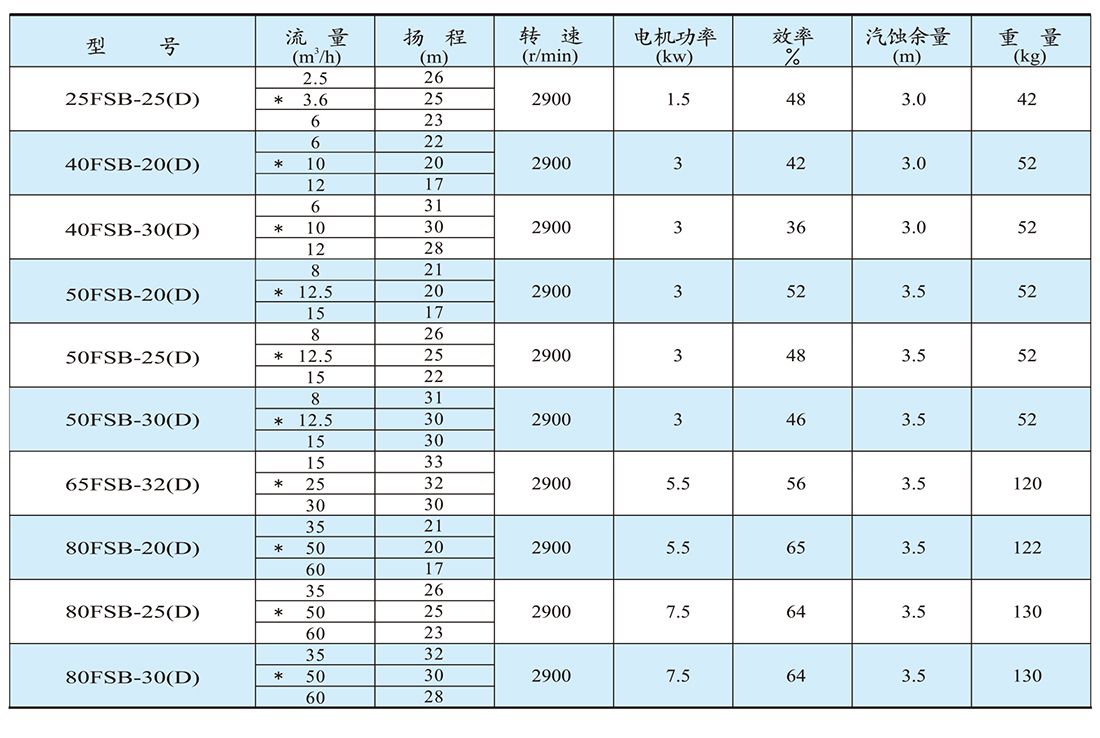 FSB型襯氟離心泵性能參數(shù)表: